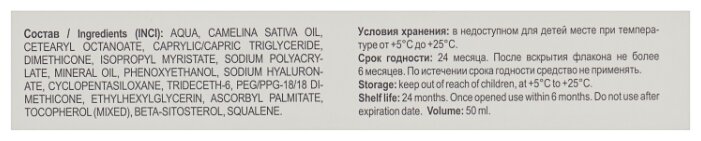 - Состав: aqua, camelina sativa oil, cetearyl octanoate, caprylic/capric triglyceride, dimethicone, isopropyl myristate, sodium polyacrylate, mineral oil, phenoxyethanol, sodium hyaluronate, cyclopentasiloxane, trideceth-6, peg/ppg-18/18 dimethicone, ethylhexylglycerin, tocopherol (mixed), beta-sitosterol, squalene, glyceryl linolenate