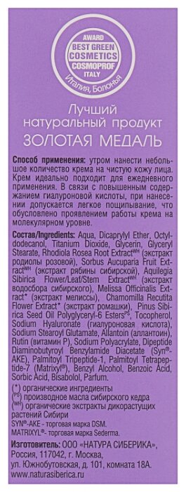 - Состав: aqua, dicaprylyl ether, octyldodecanol, titanium dioxide, glycerin, glyceryl stearate, rhodiola rosea root extract (родиола розовая), pine oil polyglyceryl-6 esters, allantoin (аллантоин), tocopherol, sodium stearoyl glutamate, sorbus sibirica extract (рябина сибирская), aquilegia sibirica extract (водосбор сибирский), sodium hyaluronate (гиалуроновая кислота), melissa officinalis extract (мелисса), chamomilla recutita flower extract (ромашка), rutin (витамин p), sodium polyacrylate, syn-ake, palmitoyl oligopeptide, palmitoyl tetrapeptide-3, benzyl alcohol, benzoic acid, sorbic acid, bisabolol, parfum