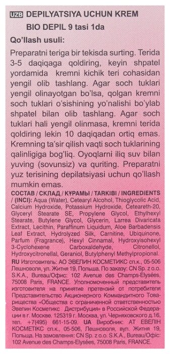 - Способ применения: нанесите крем на кожу и равномерно распределите его закругленной частью лопатки, чтобы он полностью покрыл волос. Оставьте крем на коже на 5 минут, а затем осторожно очистите небольшой участок лопаткой. Если волосы легко удаляются, широким или узким концом лопатки (в зависимости от части тела) уберите оставшийся крем. Если необходимо, оставьте крем на коже еще на несколько минут, но не более чем на 10 минут в целом. Тщательно промойте кожу водой после окончания процедуры и вытрите насухо