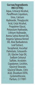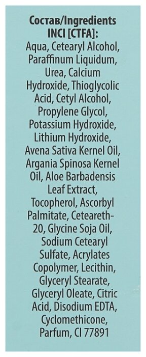 - Состав: aqua, cetearyl alcohol, paraffinum liquidum, potassium thioglycolate, calcium hydroxide, ceteareth-20, talc, glycerin, parfum, polyethylene, sodium gluconate, aloe barbadensis leaf juice, hexyl cinnamal, linalool, citric acid, potassium sorbate, sodium benzoate