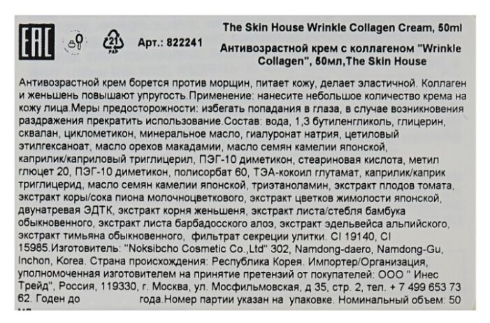 Морской коллаген, содержащийся в креме The Skin House Wrinkle System Wrinkle Collagen, помогает восстановить поврежденные клетки кожи, улучшить ее упругость и эластичность. Восстанавливающие и регенерирующие свойства средства становятся заметны после первой недели применения, кожа становится заметно моложе, а нежная бархатистая поверхность визуально способствуют снижению возрастных проявлений.