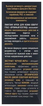 - Дополнительная информация: масло северной морошки, масло семени сосны сибирской; экстракты черной икры, арники, цветов мальвы, овса, лабазника, рябины сибирской, родиолы розовой, рвеяницы алтайской, сосны кедровой сибирской, ели сибирской, кедрового стланика, диплазиума сибирского, вечерницы сибирской