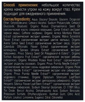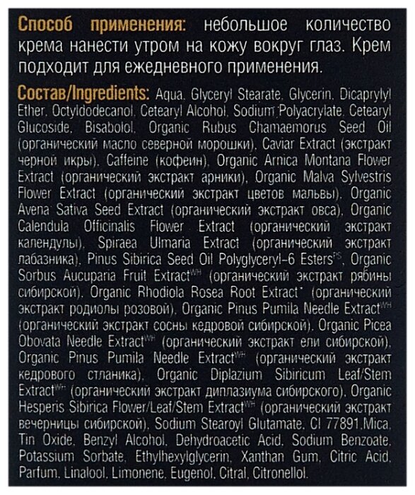 - Состав: aqua, glyceryl stearate, glycerin, dicaprylyl ether, octyldodecanol, cetearyl alcohol, sodium, polyacrylate, cetearyl, bisabolol, rubus chamaemorus seed оil (масло северной морошки), caviar extract (экстракт черной икры), caffeine (кофеин), arnica montana rower extract (экстракт арники), malva sylvestris flower extract (экстракт цветов мальвы), avena sativa kernel extract (экстракт овса), calendula officinalis flower extract (экстракт календулы), spiraea ulmaria extract (экстракт лабазника), pinus sibirica seed oil polyglyceryl-6 esters(ps), sorbus sibirica extract(wh) (экстракт рябины сибирской), rhodiola rosea root extract(wh) (экстракт родиолы розовой), festuca altaica extract (экстракт рвеяницы алтайской), pinus pumila needle extract (экстракт сосны кедровой сибирской), picea obovata needle extract (экстракт ели сибирской), pinus pumila needle extract (экстракт кедрового стланика), diplazium sibiricum extract (экстракт диплазиума сибирского), hesperia sibirica extract (экстракт вечерницы сибирской), sodium stearoyl glutamate, cl 77891, mica, tin oxide, benzyl alcohol, dehydroacetic acid, sodium benzoate, potassium sorbate, ethylhexylglycerin, xanthan gum, citric acid, parfum, linalool, limonene, eugenol, citral, citronellol