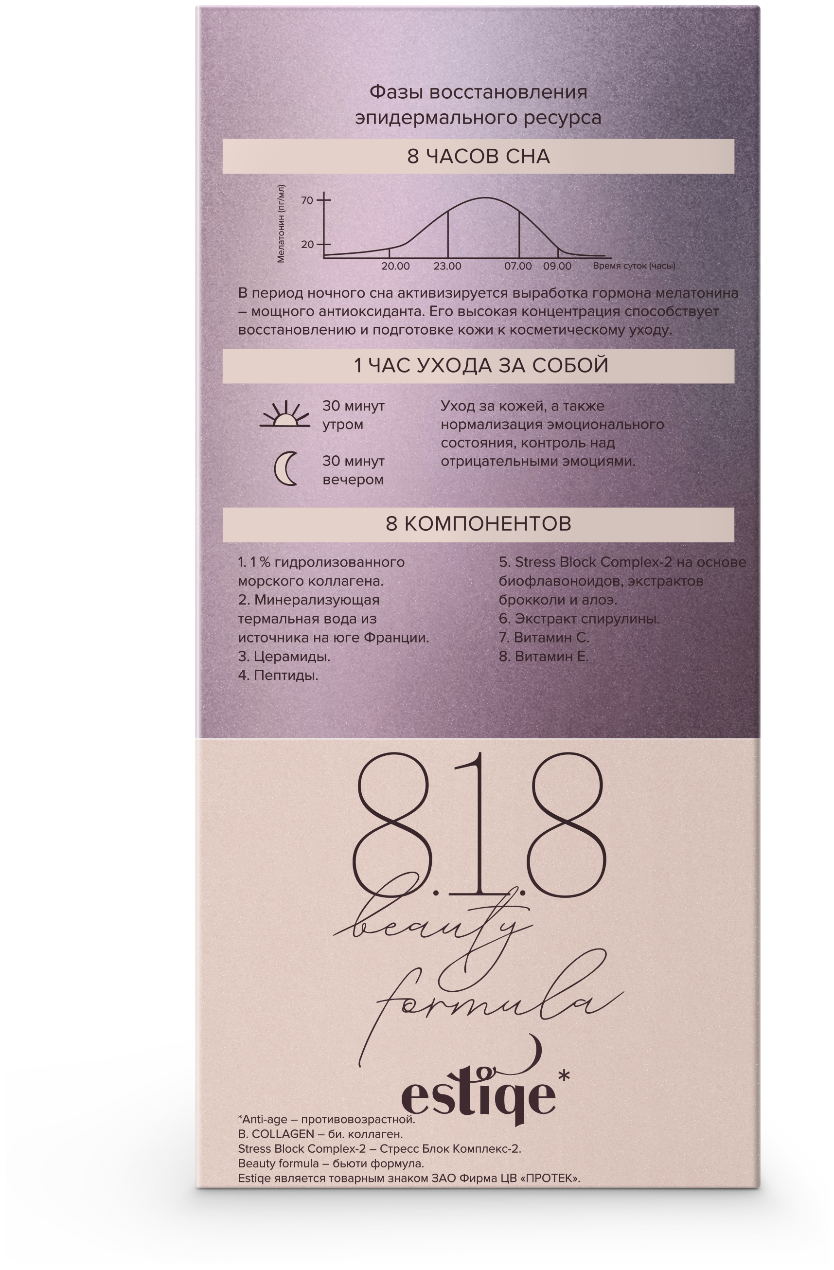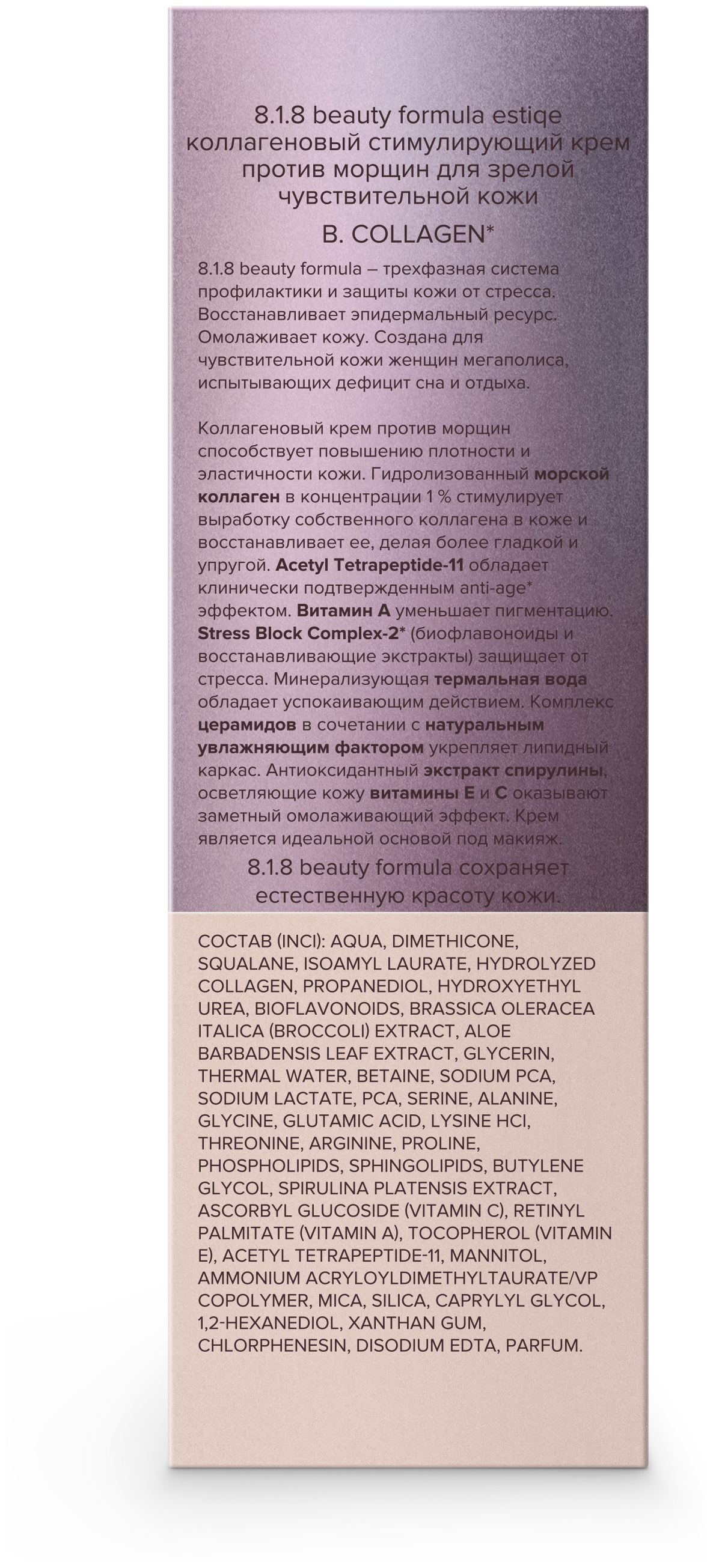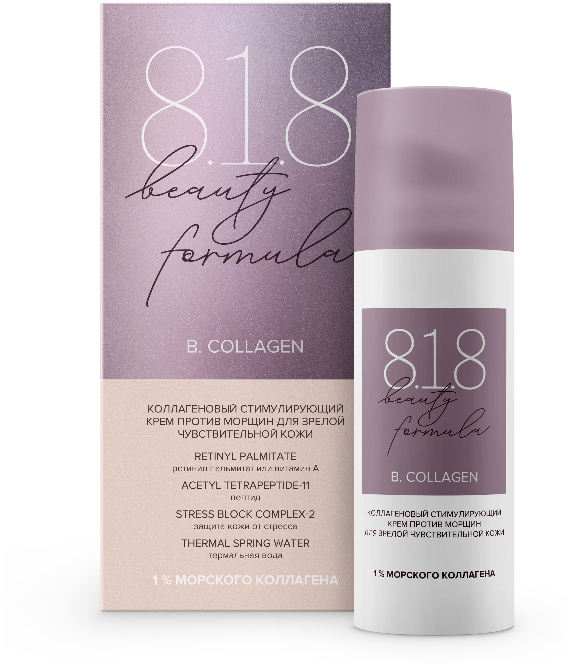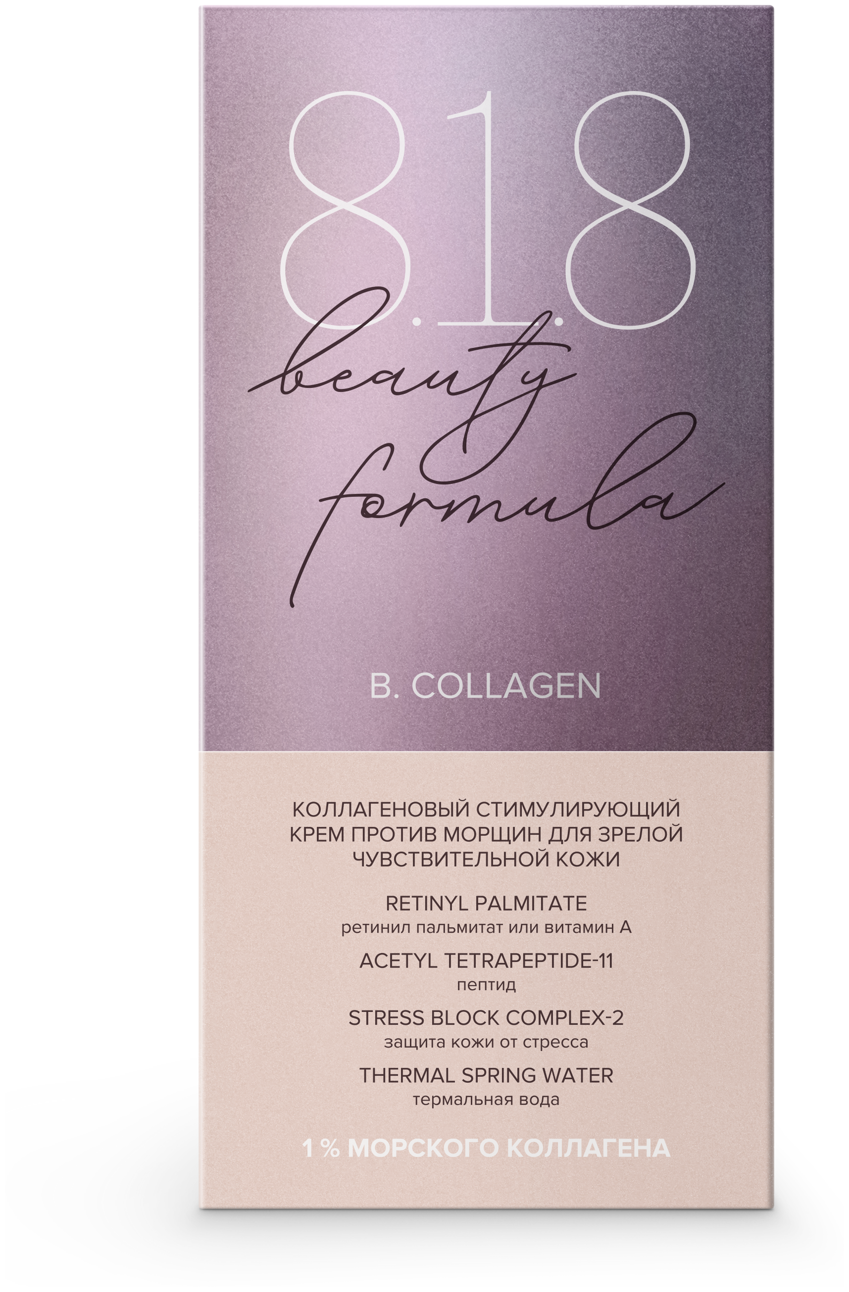 Одна из проблем возрастной кожи – потеря упругости и снижение плотности кожного покрова. Крем 8.1.8 beauty formula позволяет компенсировать недостаток эластичности кожи, уменьшает глубину морщин, повышает синтез коллагеновых волокон за счет содержания в составе гидролизованного морского коллагена. Всего 1% такого вещества достаточно для стимуляции собственного коллагена, кожа становится более упругой и молодой.