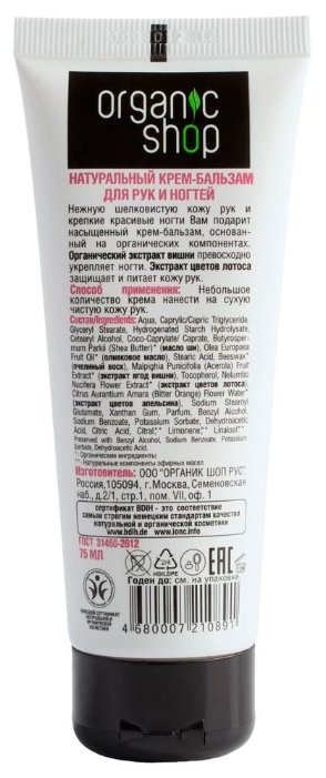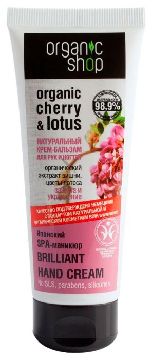 Органические компоненты, экстракты пыльцы лотоса и вишни делают крем Organic Shop лучшим средством для увлажнения и питания кожи рук. В составе средства есть воск, который препятствует потери влаги, а дополнительные компоненты в виде масла карите питают и насыщают клетки кожи витаминами А, В и С.