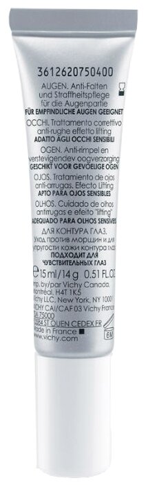 Лифтинг эффект для подтягивания контура глаз от Vichy ощущается с первого применения, его использование позволяет улучшить цвет кожи вокруг глаз, устраняет эффект уставших глаз, подтягивает и питает кожу. Выраженный антивозрастной эффект достигается спустя неделю применения, в составе активных ингредиентов – гиалуроновая кислота для контроля влаги и кофеин для антиоксидантного и тонизирующего эффекта.
