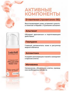 Кожа вокруг глаз и в области век очень тонкая, она лишена достаточного количества сальных желез, которые бы защищали ее от обезвоживания, а потому именно эта область лица первой выдает возраст. Крем с мочевиной для коррекции гусиных лапок LooksWell оказывает омолаживающий и подтягивающий эффект, визуально снижает проявления глубоких морщин и восполняет недостаток влаги в дерме.