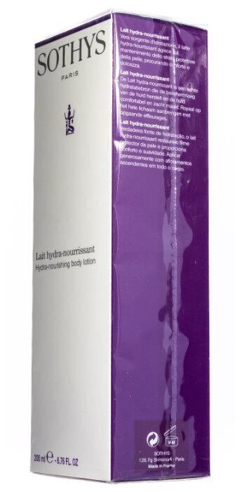 Стойкое питание и увлажнение оказывает на кожу тела крем Sothys Hydra-Nourishing Body Lotion. Преимущества данного продукта – антивозрастной эффект, увлажнение и контроль влаги, защитные свойства и контроль липидного баланса клеток кожи. В качестве дополнительных составляющий – вытяжка зародышей пшеницы, масло карите.