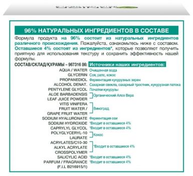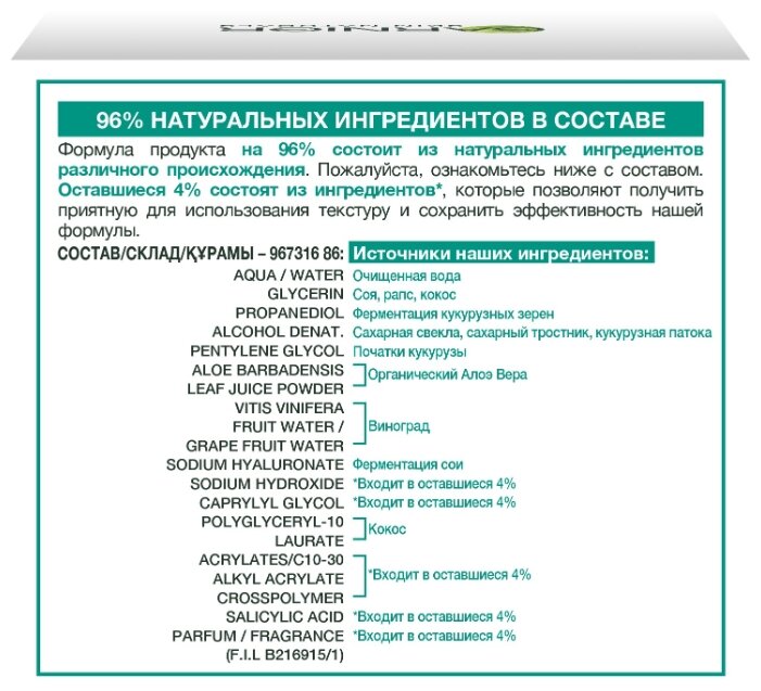 - Состав: aqua / water, glycerin, propanediol, alcohol denat., pentylene glycol, aloe barbadensis leaf juice powder, vitis vinifera fruit water / grape fruit water, sodium hyaluronate, sodium hydroxide, caprylyl glycol, polyglyceryl-10, laurate acrylates/c10-30 alkyl acrylate, crosspolymer, salicylic acid, parfum / fragrance