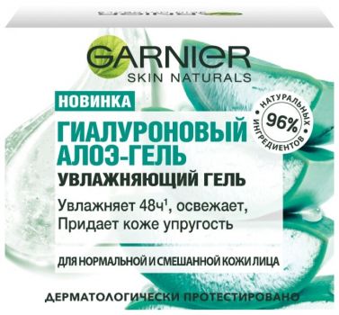 Легкое и невесомое увлажнение нормальной и жирной кожи лица обеспечивает нормализацию работу сальных желез и создает защитную пленочку на поверхности эпидермиса. Прозрачный гель GARNIER на основе гиалуроновй кислоты рекомендуется использовать для увлажнения кожи в летнее время.