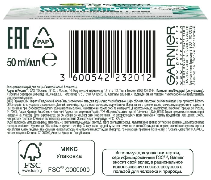 3. GARNIER Гиалуроновый Алоэ-гель увлажняющий для лица