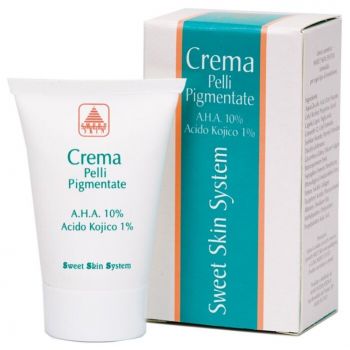 Эффективное осветление пигментации кожи возможно с помощью фруктовых или молочных кислот. Крем Sweet Skin System Pelli Pigmentate итальянского производства содержит в своем составе до 10% кислот AHA, что позволяет осветлить уже существующие пигментные пятна на 80% при использовании средства через день.