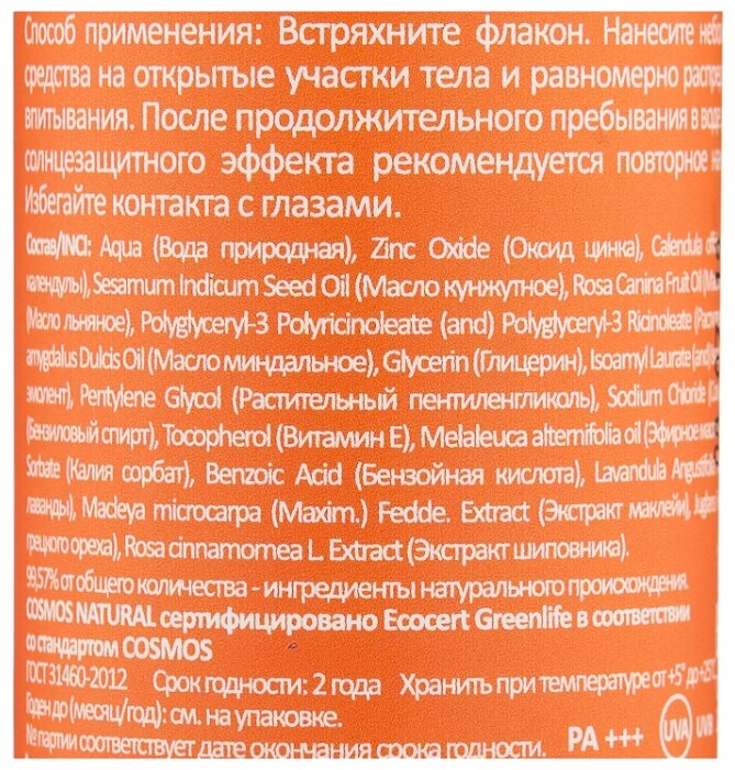 - Состав: aqua (вода природная), zinc oxide (оксид цинка), calendula officinalis floral water (гидролат календулы), sesamum indicum seed oil (масло кунжутное), rosa canina fruit oil (масло шиповника), leen seed oil (масло льняное), polyglyceryl-3 polyricinoleate (and) polyglyceryl-3 ricinoleate (растительный эмульгатор), prunus amygdalus dulcis oil (масло миндальное), glycerin (глицерин), isoamyl laurate (and) isoamyl cocoate (растительный эмолент), pentylene glycol (растительный пентиленгликоль), sodium chloride (соль морская), benzyl alcohol (бензиловый спирт), tocopherol (витамин е), melaleuca alternifolia oil (эфирное масло чайного дерева), potassium sorbate (калия сорбат), benzoic acid (бензойная кислота), lavandula angustifolia flower oil (эфирное масло лаванды), macleya microcarpa (maxim.) fedde. extract (экстракт маклейи), juglans regia leaf extract (экстракт грецкого ореха), rosa cinnamomea l. extract (экстракт шиповника)