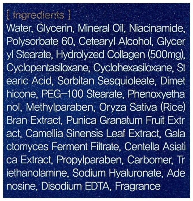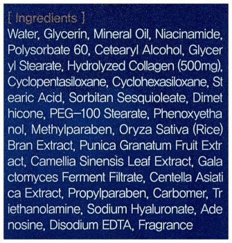 - Состав: water, glycerin, mineral oil, niacinamide, polysorbate 60, cetearyl alcohol, glyceryl stearate, hydrolyzed collagen (500mg), cyclopentasiloxane, cyclohexasiloxane, stearic acid, sorbitan sesquioleate, dimethicone, peg-100 stearate, phenoxyethanol, methylparaben, oryza sativa (rice) bran extract, punica granatum fruit extract, camellia sinensis leaf extract, galactomyces ferment filtrate, centella asiatica extract, propylparaben, carbomer, triethanolamine, sodium hyaluronate, adenosine, disodium edta, fragrance