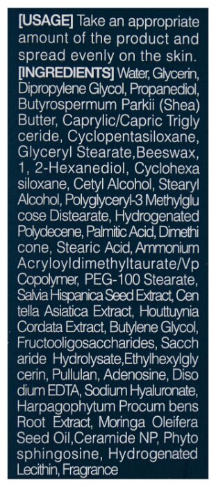 - Состав: water, glycerin, dipropylene glycol, propanediol, butyrospermum parkii (shea) butter, caprylic/capric triglyceride, cyclopentasiloxane, glyceryl štearate,beeswax, 1, 2-hexanediol, cyclohexasiloxane, cetyl alcohol, stearyl alcohol, polyglyceryl-3 methyl glucose distearate, hydrogenated polydecene, palmitic acid, dimethicone, stearic acid, ammonium acryloyldimethyltaurate/vp copolymer, peg-100 stearate, savia hispanica seed extract, centella asiatica extract, houttuynia cordata extract, butylene glycol, fructooligosaccharides, saccharide hydrolysate, ethylhexylglycerin, pullulan, adenosine, disodium edta, sodium hyaluronate, harpagophytum procumbens root extract, moringa oleifera seed oil,ceramide np, phyto sphingosine, hydrogenated lecithin, fragrance